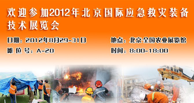 我司于2012年8月29日参加欢迎参加2012年北京国际应急救灾装备技术展览会,敬请各位新老客户莅临参观指导!地址:朝阳区东三环北路16号参展日期:2012年8月29日-31日参展时间:8:00-18:00摊 位 号:A-20参展地点:北京.全国农业展览馆