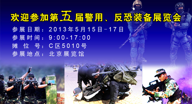 我司于2013年5月15日参加第5届警用、反恐装备展览会,敬请各位新老客户莅临参观指导!