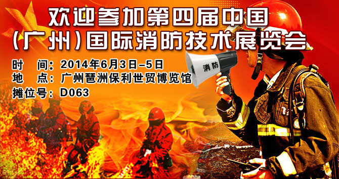 我司于2014年6月3日参加第四届中国(广州)国际消防技术展览会,敬请各位新老客户莅临参观指导!参展日期:2014年6月3日-5日参展时间:8:00-18:00摊位号: D063参展地点:广州琶洲保利世贸博览馆地址: 广州市海珠区新港东路1000号