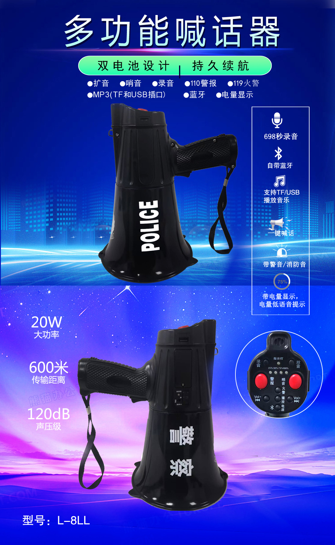 • 专业设计,外观独特、新颖,操作简便的多功能喊话器