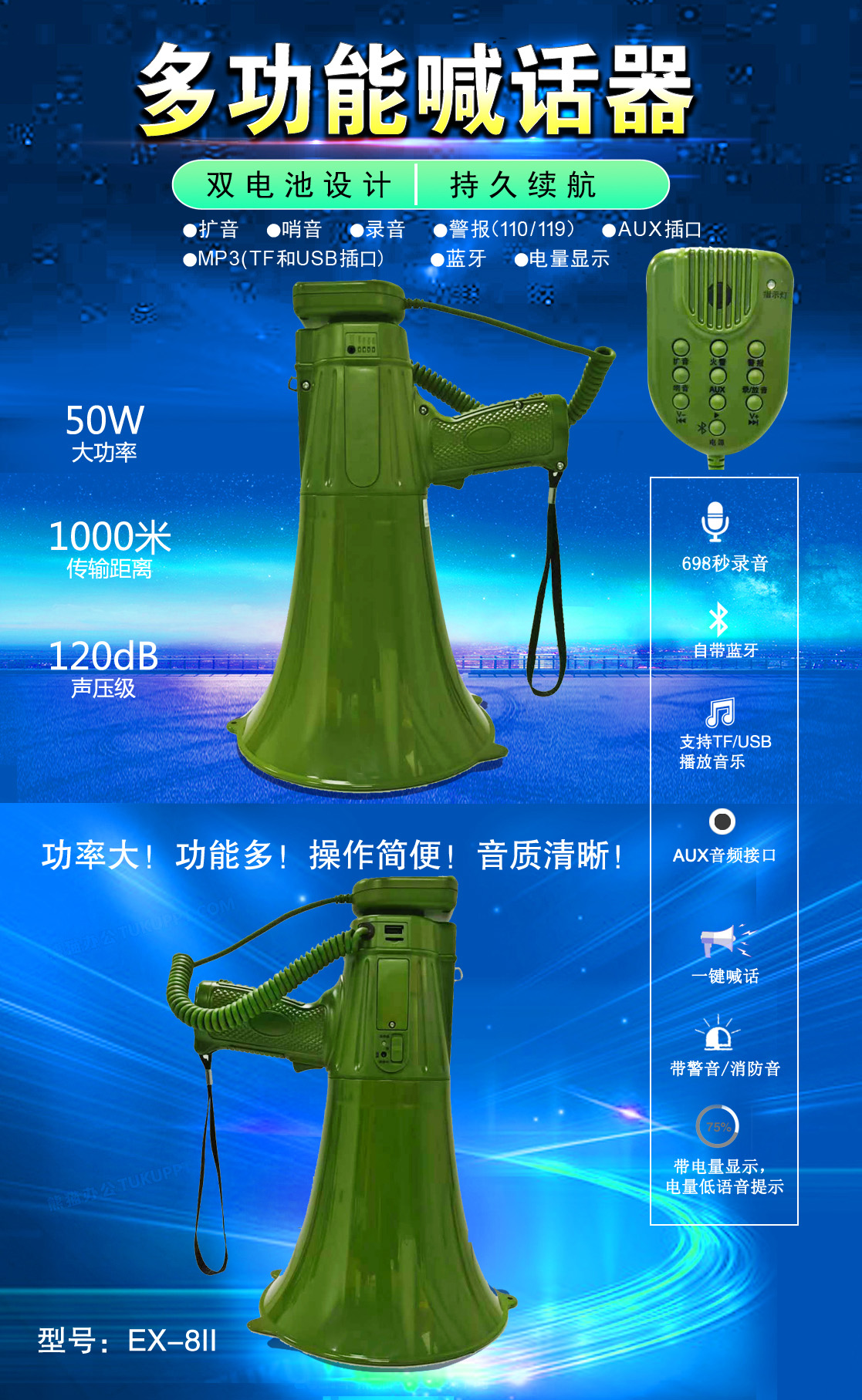 • 专业设计,外观独特、新颖,操作简便的多功能喊话器