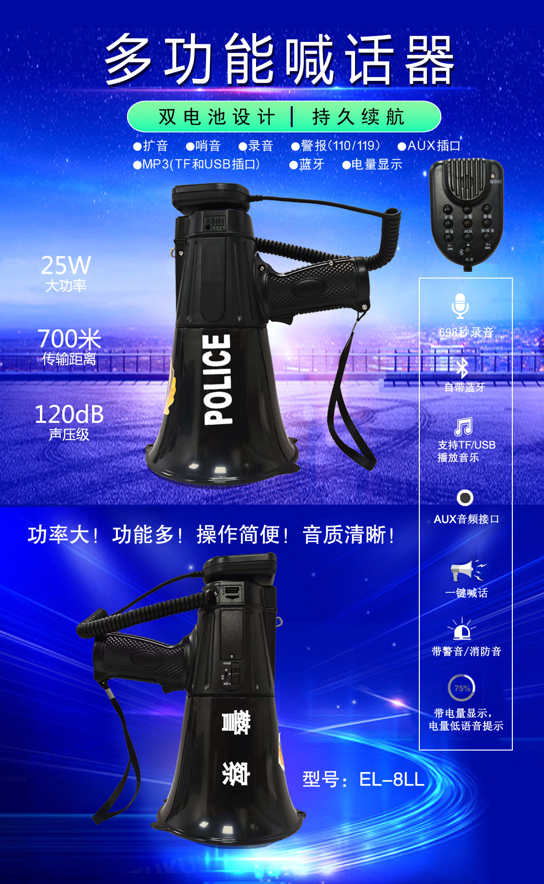 • 专业设计,外观独特、新颖,操作简便的多功能喊话器